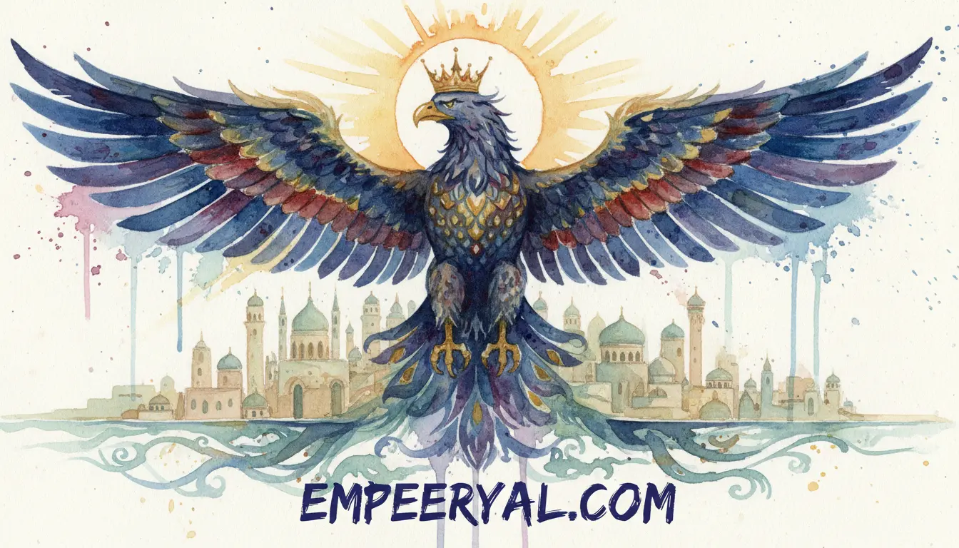 Ornate emblem: Crowned blue/red eagle, "EMPEERYAL.COM" banner, castles, river, sun, stars in a detailed frame.