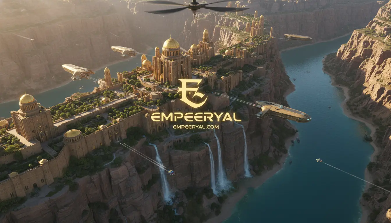 Gold EMPEERYAL.COM text floats over a futuristic city with flying cars and a glowing platform reflecting digital light.