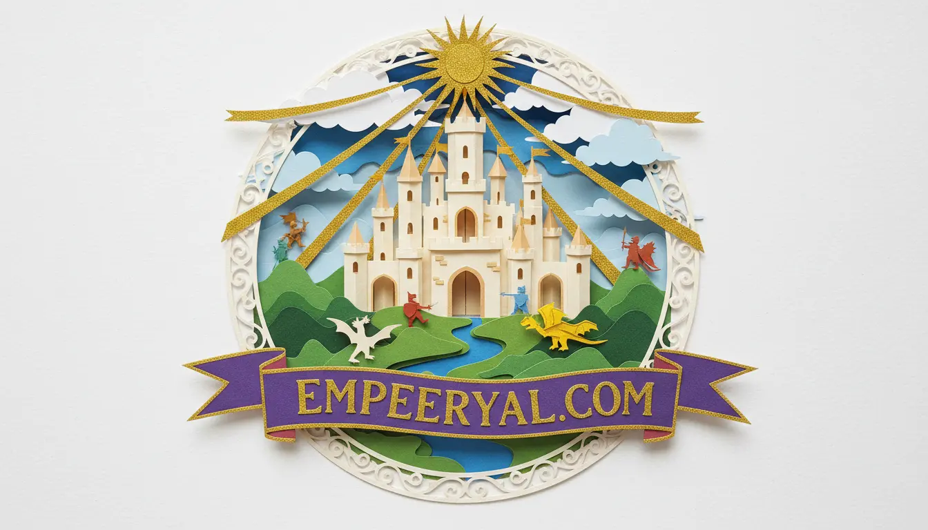 Vibrant papercraft castle with a golden crown, lion, blue river, & mountains. Text: EMPEERYAL.COM.